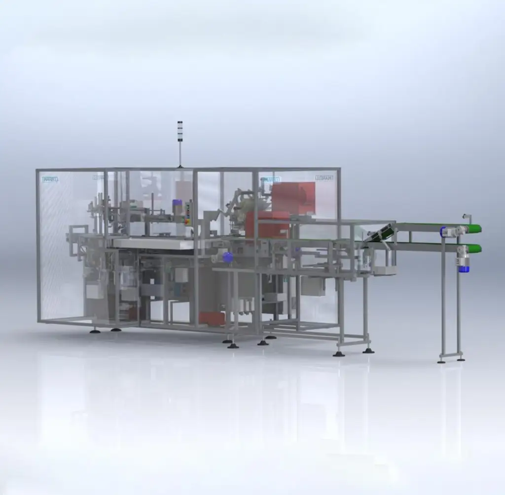 • Abbinamento con machine per fissaggio con piega automatica del prodotto. Possibilità di impilare 2 o 3 paia di gambaletti.